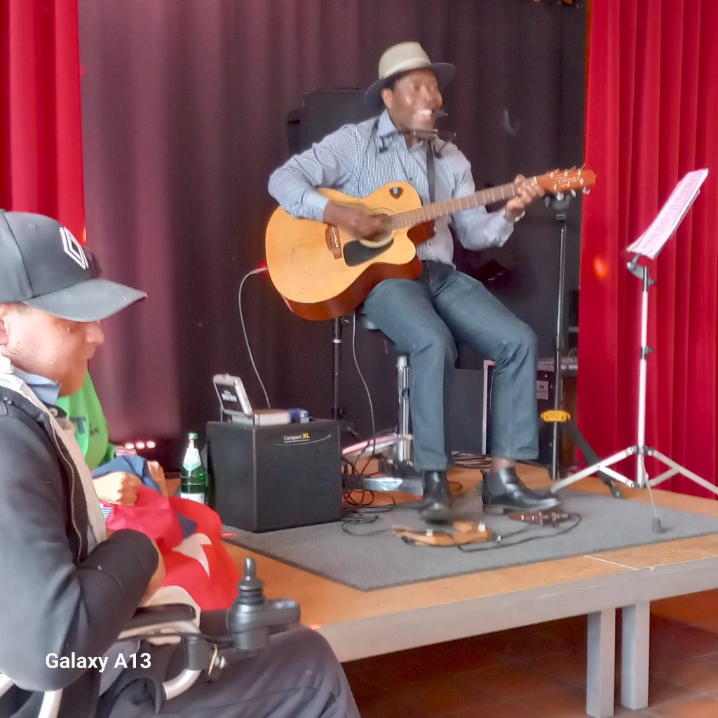 Mit großer Begeisterung wurde der Düsseldorfer Künstler Joe Kiki im Rathaus der Theodor Fliedner Stiftung nicht nur begrüßt, sondern auch gefeiert. Egal, ob er mit der Gitarre, der Mundharmonika oder dem Saxophon auftrat; die über 80 Zuschauer waren begeistert. Er trat mit Sicherheit nicht zum letzten Mal bei uns auf.
